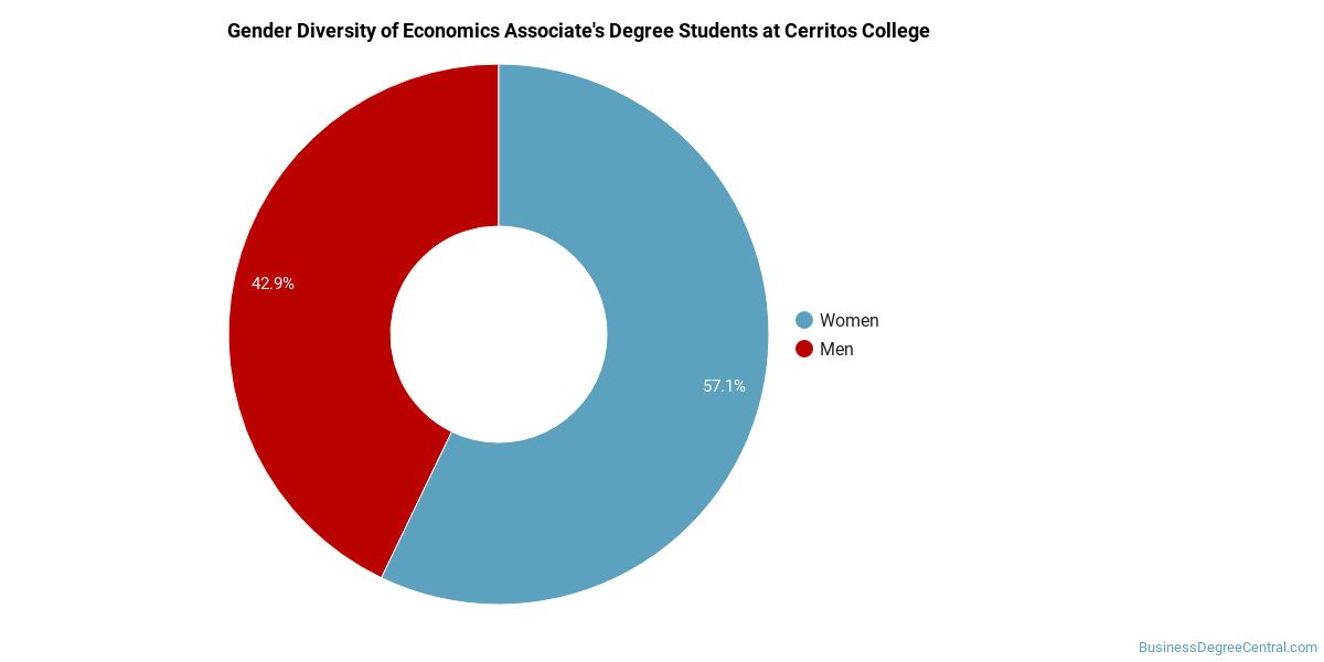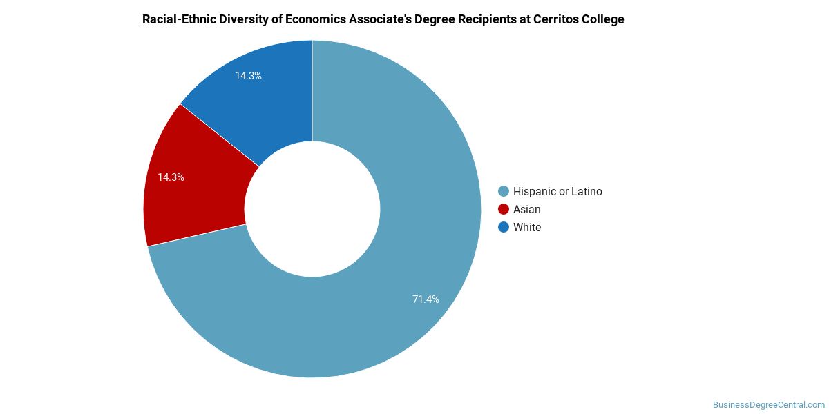 Cerritos College does a better job with serving racial-ethnic minorities than the typical school does. Its associate's program in economics graduates 64% more racial-ethnic minorities than the nationwide average.*