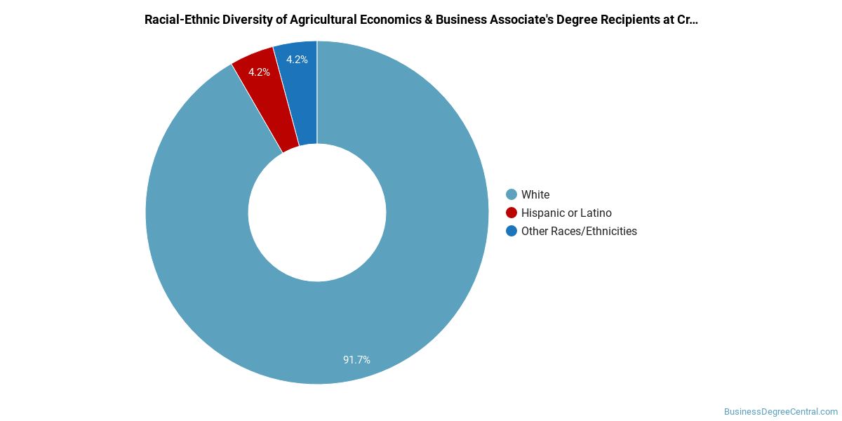 The majority of those who receive an associate's degree in agricultural business at Crowder College are white. Around 100% fell into this category, which is below average for this degree.