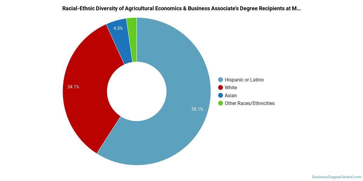Merced Community College District does a better job with serving racial-ethnic minorities than the typical school does. Its associate's program in agricultural business graduates 25% more racial-ethnic minorities than the nationwide average.*