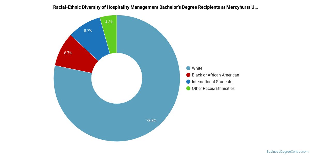 About 60% of those who receive a bachelor's degree in hospitality at Mercyhurst are white. This is above average for this degree on the nationwide level.