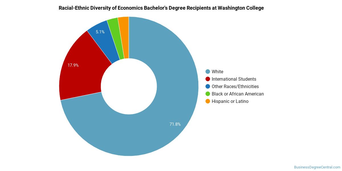 About 68% of those who receive a bachelor's degree in economics at Washington College are white. This is above average for this degree on the nationwide level.